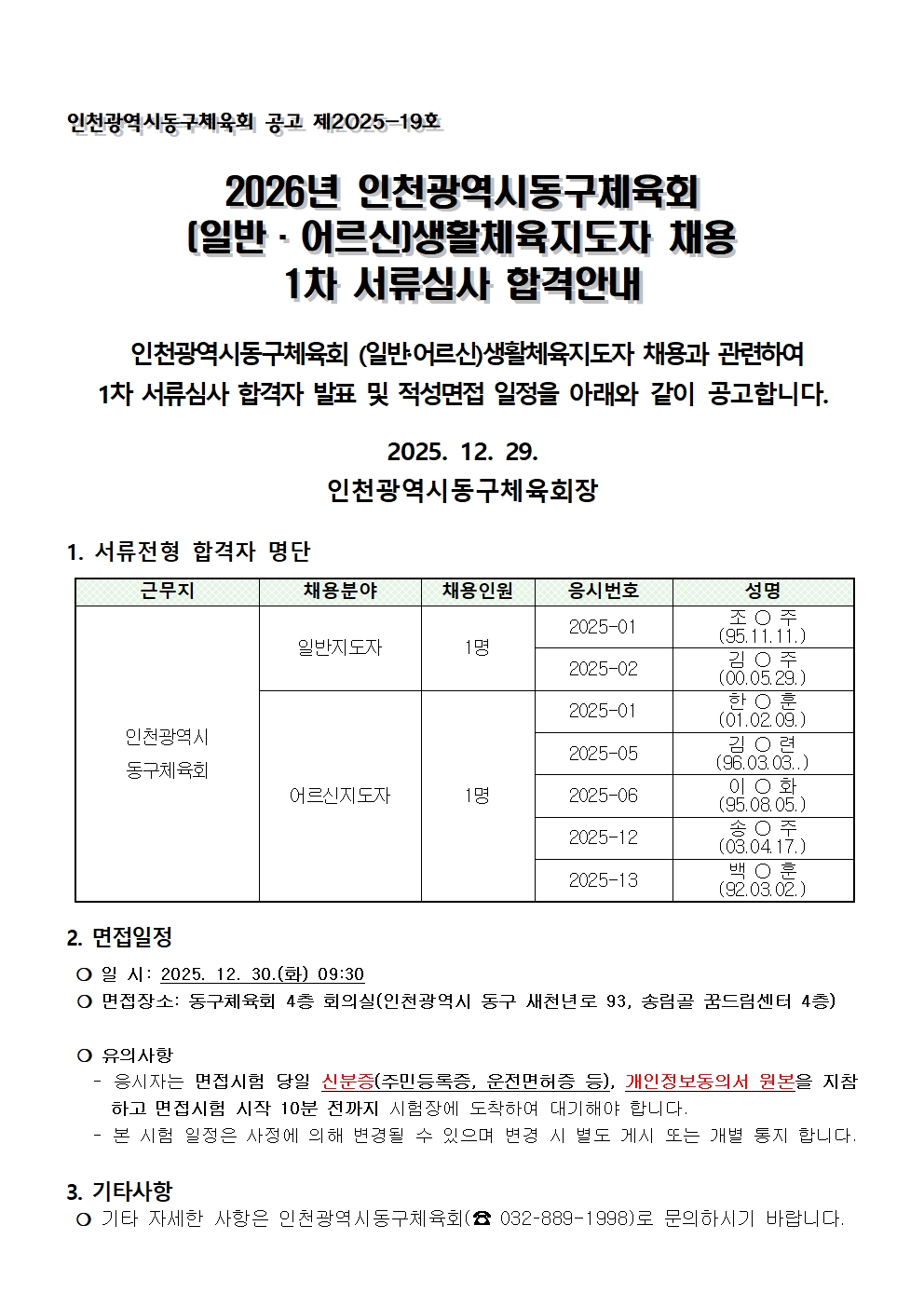 2026년 인천광역시동구체육회 생활체육지도자 (일반/어르신) 최종 합격자 안내