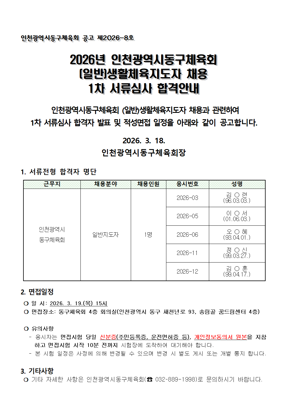 2026년 생활체육지도자(일반) 1차 서류심사 합격자 공고